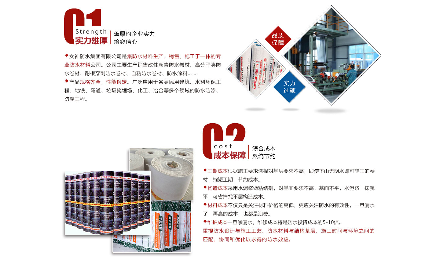 安徽女神建材科技集團有限公司是集防水材料研發(fā)、生產(chǎn)、銷售、施工為一體的綜合性防水材料集團公司。我公司旗下有多條大型一次成型生產(chǎn)線:SBS改性瀝青防水卷材,DTM聚酯復(fù)合高分子防水卷材,非瀝青基高分子防水卷材,PVC,TPO高分子防水卷材等生產(chǎn)線。我公司秉承“創(chuàng)新發(fā)展、實惠用戶”為宗旨,確保生產(chǎn)材料基礎(chǔ)上推出“共享生產(chǎn)廠家”,為開發(fā)商、建筑商節(jié)約成本為理念,新理念受到用戶企業(yè)集采時一致好評和認可。在互聯(lián)網(wǎng)時代,我公司將以互聯(lián)網(wǎng)“共享”為發(fā)展理念,為開發(fā)商、建筑商、防水企業(yè)提供的產(chǎn)品,真正讓用戶企業(yè)達到巨大...